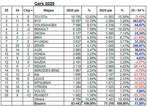 Лідерство за підсумками року втримала японська Toyota, якій вдалося реалізувати понад 10 тисяч авто. Проте справжнім феноменом став бренд BYD, який завдяки неофіційним поставкам злетів з 11-го одразу на 2-ге місце. Про це повідомляє AUTO-Consulting.