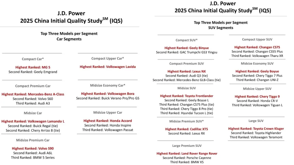 Китайський офіс J.D. Power опублікував щорічний рейтинг IQS 2025, у якому оцінювали якість нових бензинових авто.