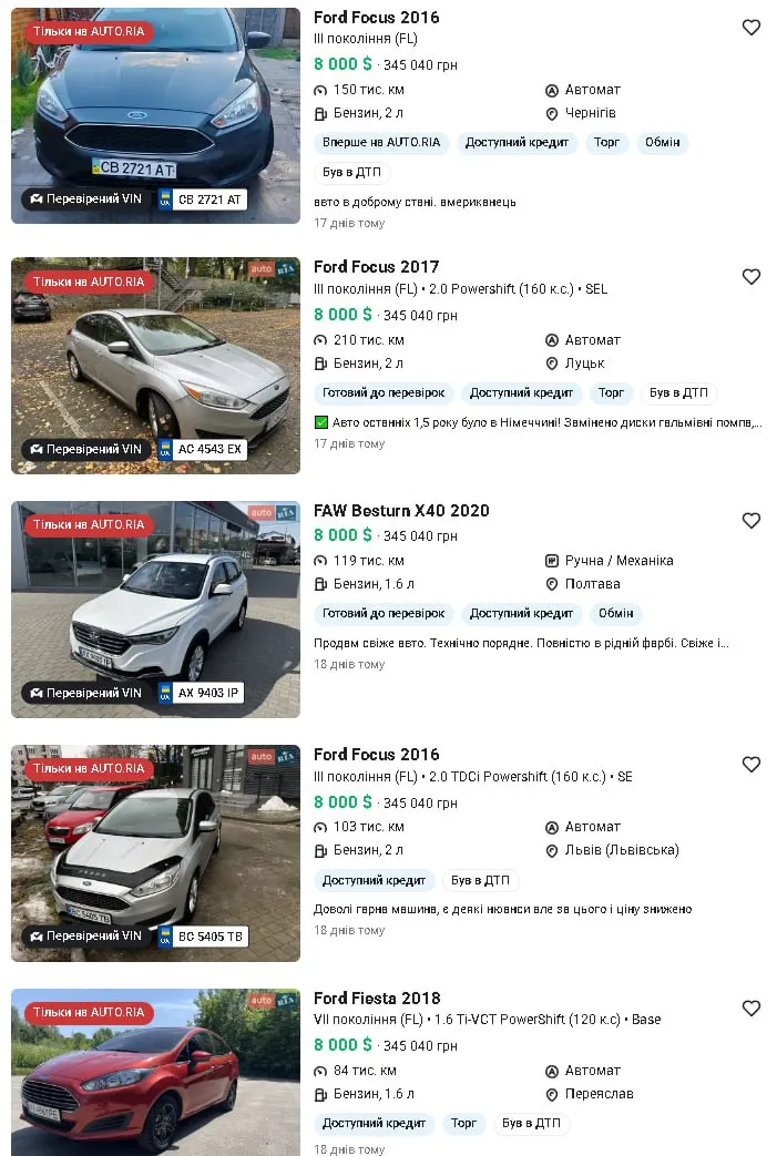 А тепер поглянемо на щось цікавіше – Ford Focus та Fiesta. Тут вибір величезний, але є один великий підводний камінь – «був у ДТП».