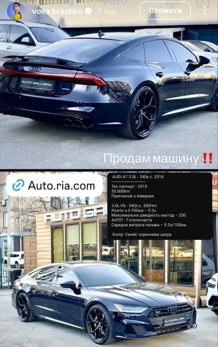 Відзначимо, що Бражко не завищував ціну лише через те, що цей автомобіль раніше належав футболісту, адже інші оголошення автомобілів Audi A7 коштують приблизно так само, а подекуди навіть дорожче – більше 50 тисяч доларів.