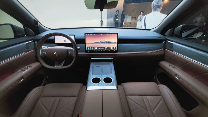Усередині — цифровий щиток приладів і два 15,6‑дюймові екрани: один для водія, інший для задніх пасажирів. Є розкладні столики, холодильник, масаж сидінь першого й другого ряду, підігрів та вентиляція.