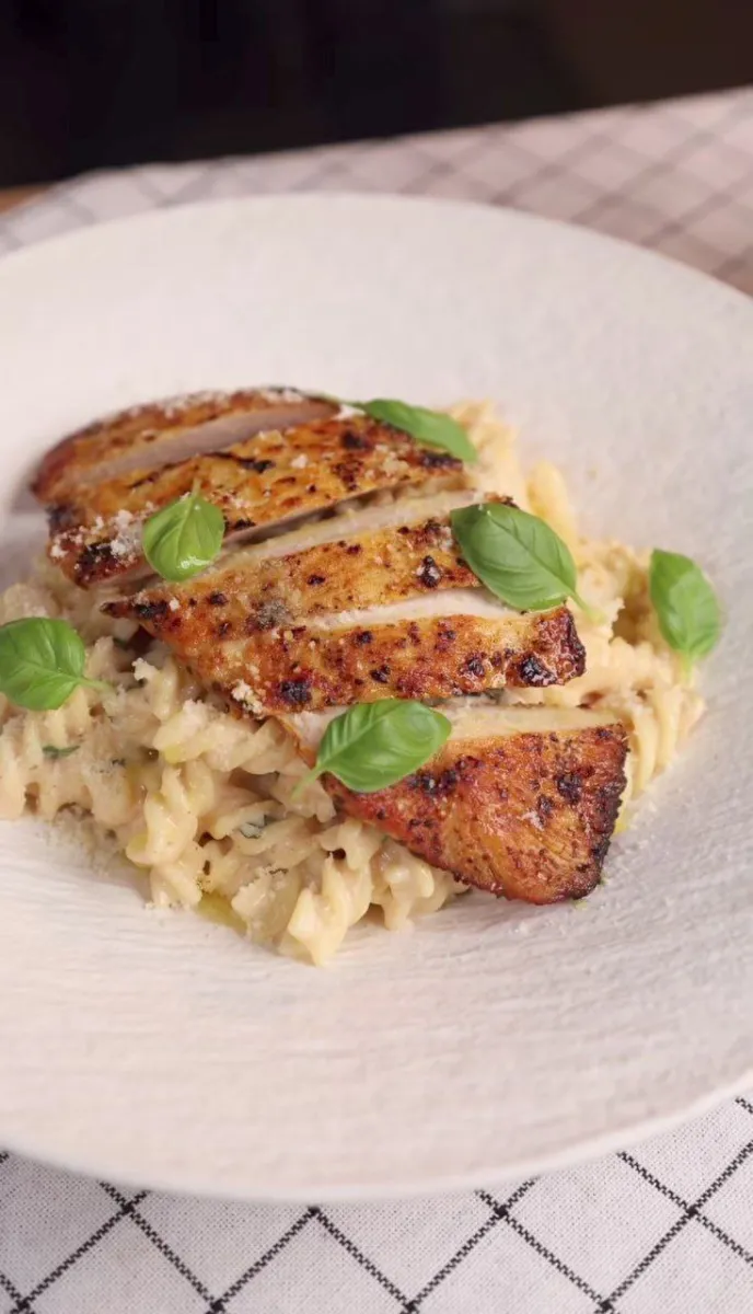- 5. Зніміть з вогню. Додайте пармезан і петрушку. Зверху покладіть нарізану слайсами курку.