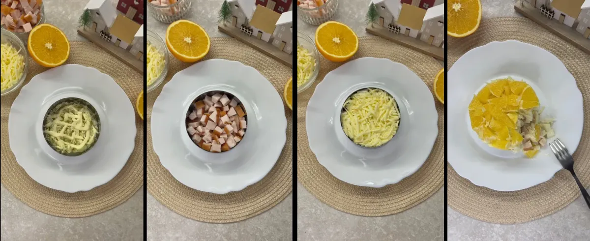Готують його шарами – капуста, курка, яйце, сир і апельсин, змащуючи кожен шар майонезом.