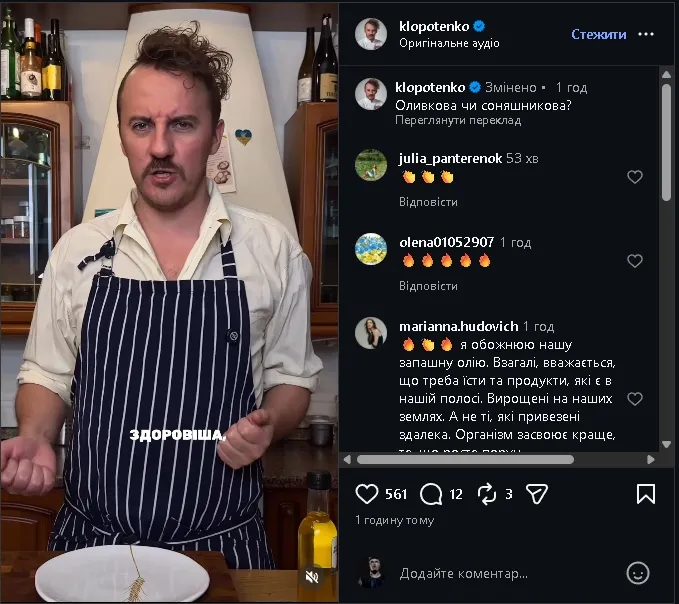 Євген Клопотенко опублікував у Instagram відео, в якому взявся за один із найпоширеніших кулінарних міфів – що оливкова олія нібито завжди краща за соняшникову.