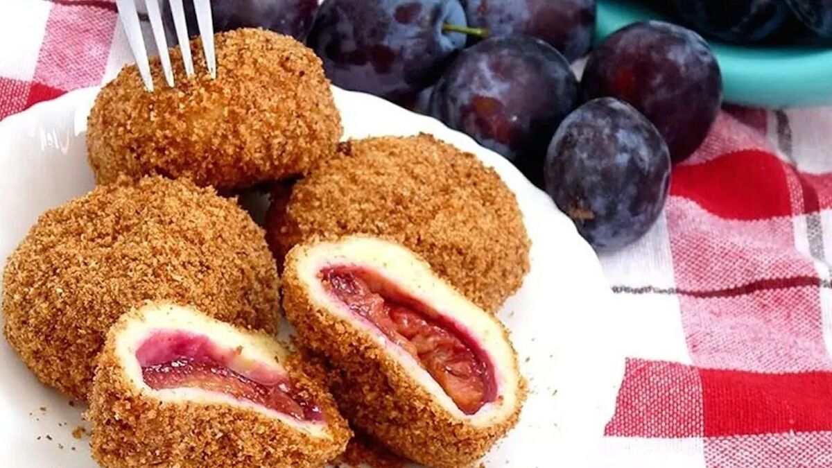 Особливість рецепта — карамелізовані сухарі. Їх розігрівають на сковороді з цукром до зміни кольору, потім обкочують у них готові вироби. Подавати можна з підсолодженою сметаною.