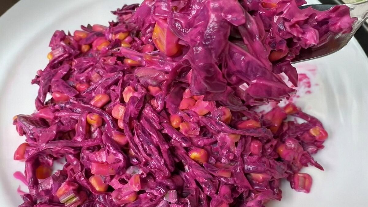 Основою страви є запечений буряк – солодкий, м’який і ароматний. До нього додають консервовану кукурудзу та дрібно нарізану зелену цибулю. Усе тримається на заправці зі сметани та гірчиці в зернах — вона додає ніжності й легкої пікантності.
