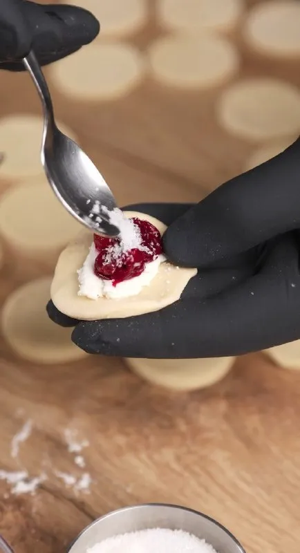 - На кожен кружечок викладіть сирну начинку, додайте вишню та трохи цукру, після чого заліпіть вареники.