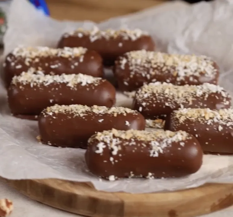 - Дошку вистелити пергаментом. Зняти плівку з сирків, наколоти на зубочистки та занурити в шоколадну глазур