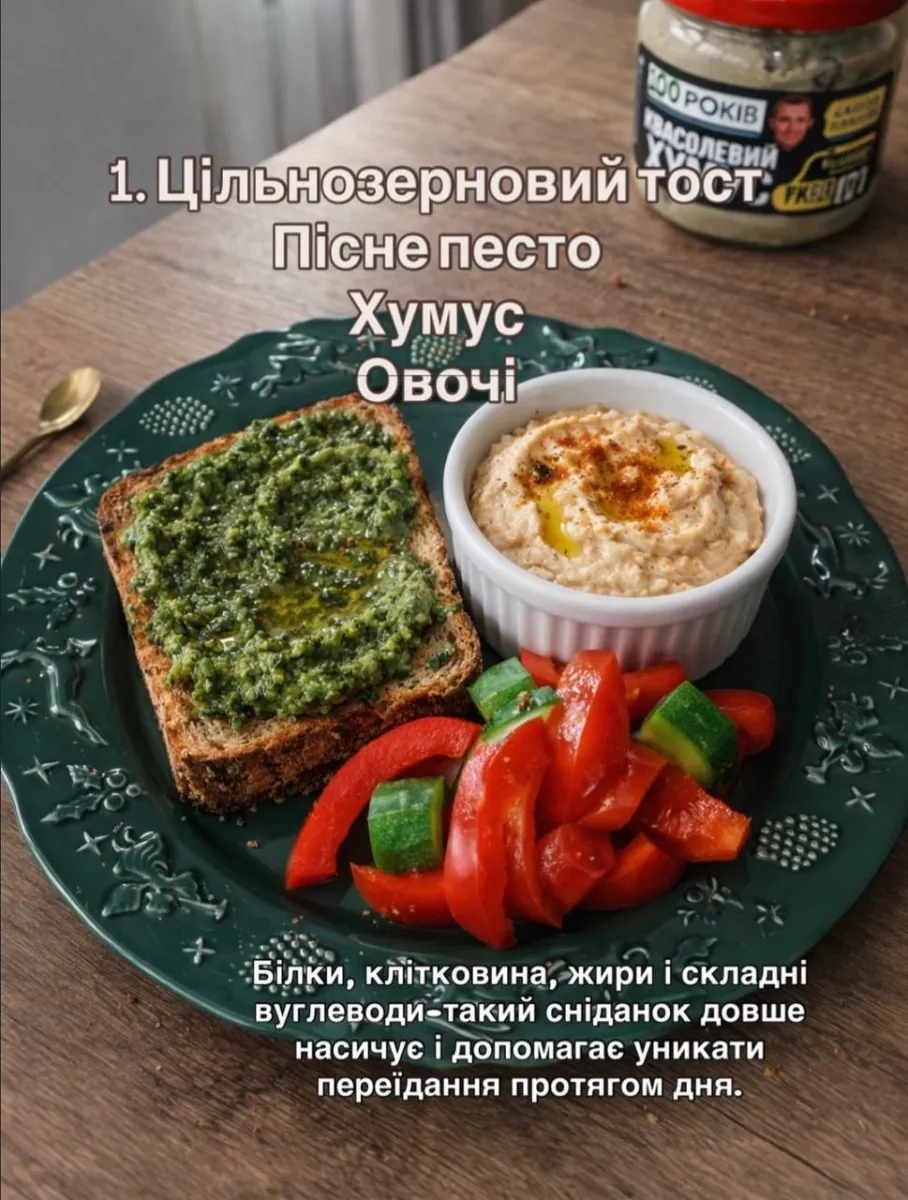 - 02 Цільнозерновий тост із пісним песто, хумусом та овочами