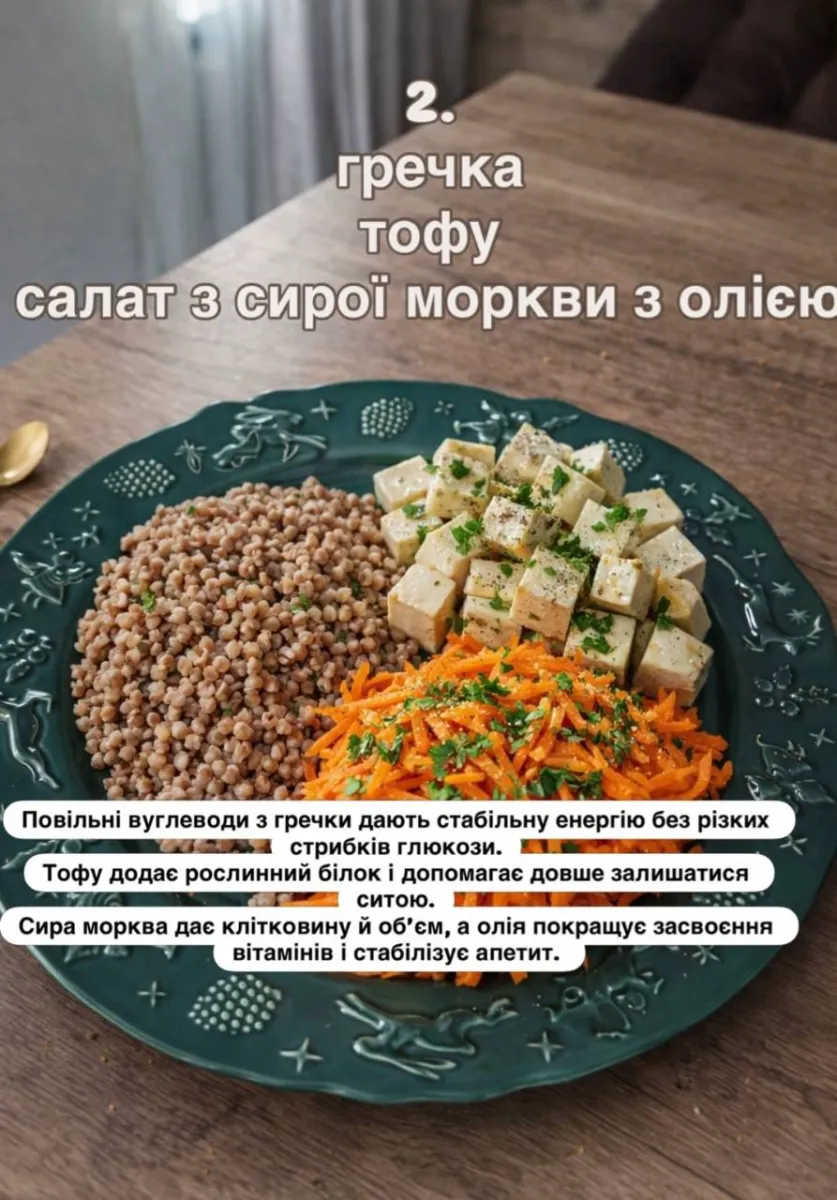 - 03 Гречка, тофу та салат із сирої моркви з олією