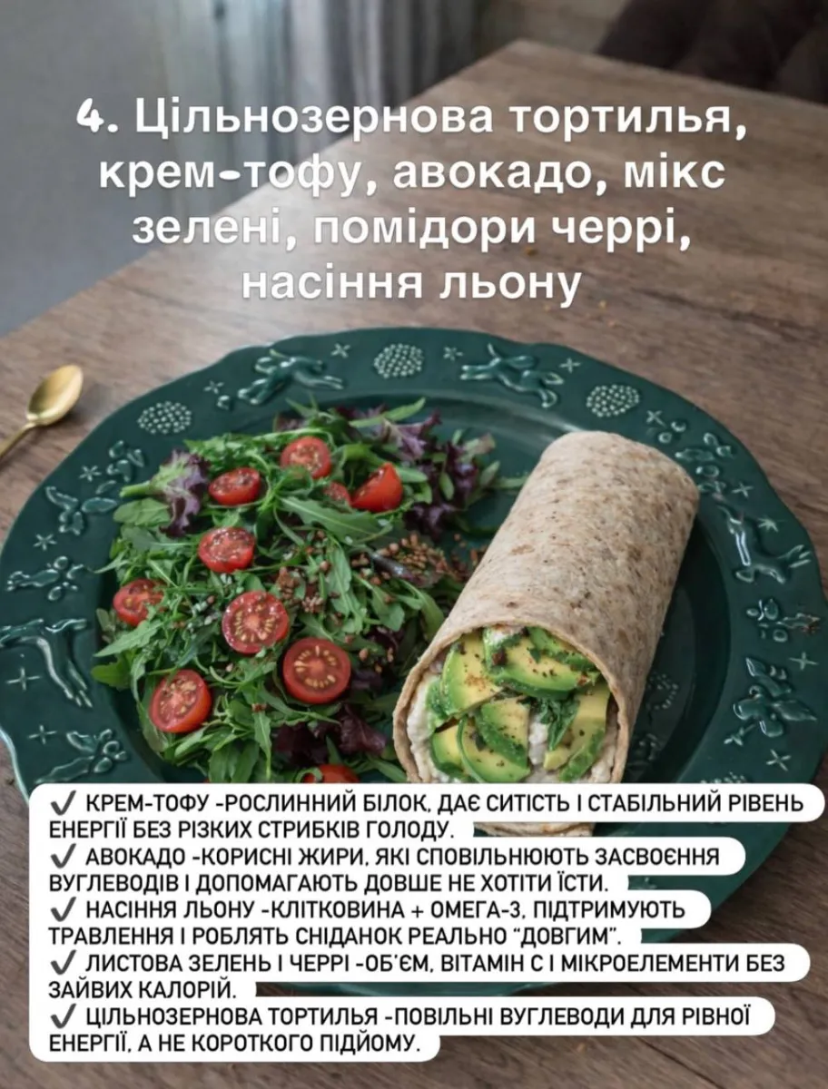Крем-тофу дає ситість і стабільний рівень енергії. Авокадо уповільнює засвоєння вуглеводів, насіння льону підтримує травлення завдяки клітковині й омега-3, а листова зелень і черрі додають вітаміни без зайвих калорій.