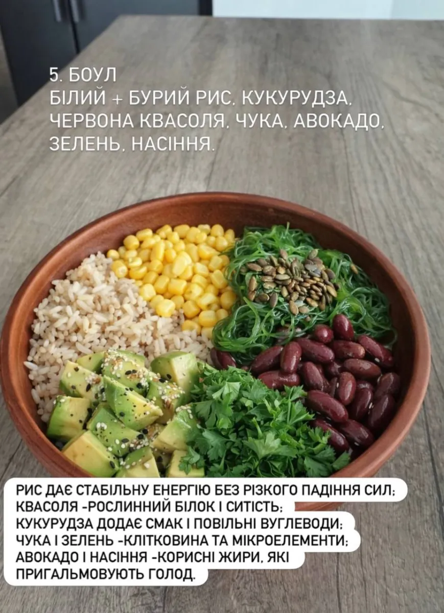 Рис забезпечує стабільну енергію без різкого падіння сил, квасоля — рослинний білок і тривалу ситість, кукурудза додає повільні вуглеводи, а авокадо з насінням гальмує відчуття голоду.