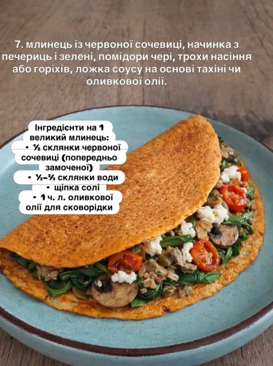 Для одного великого млинця знадобляться: ⅓ склянки попередньо замоченої червоної сочевиці, ½–⅔ склянки води, щіпка солі та 1 чайна ложка оливкової олії для сковорідки. Такий млинець — це повноцінний білковий сніданок із мінімальних інгредієнтів.