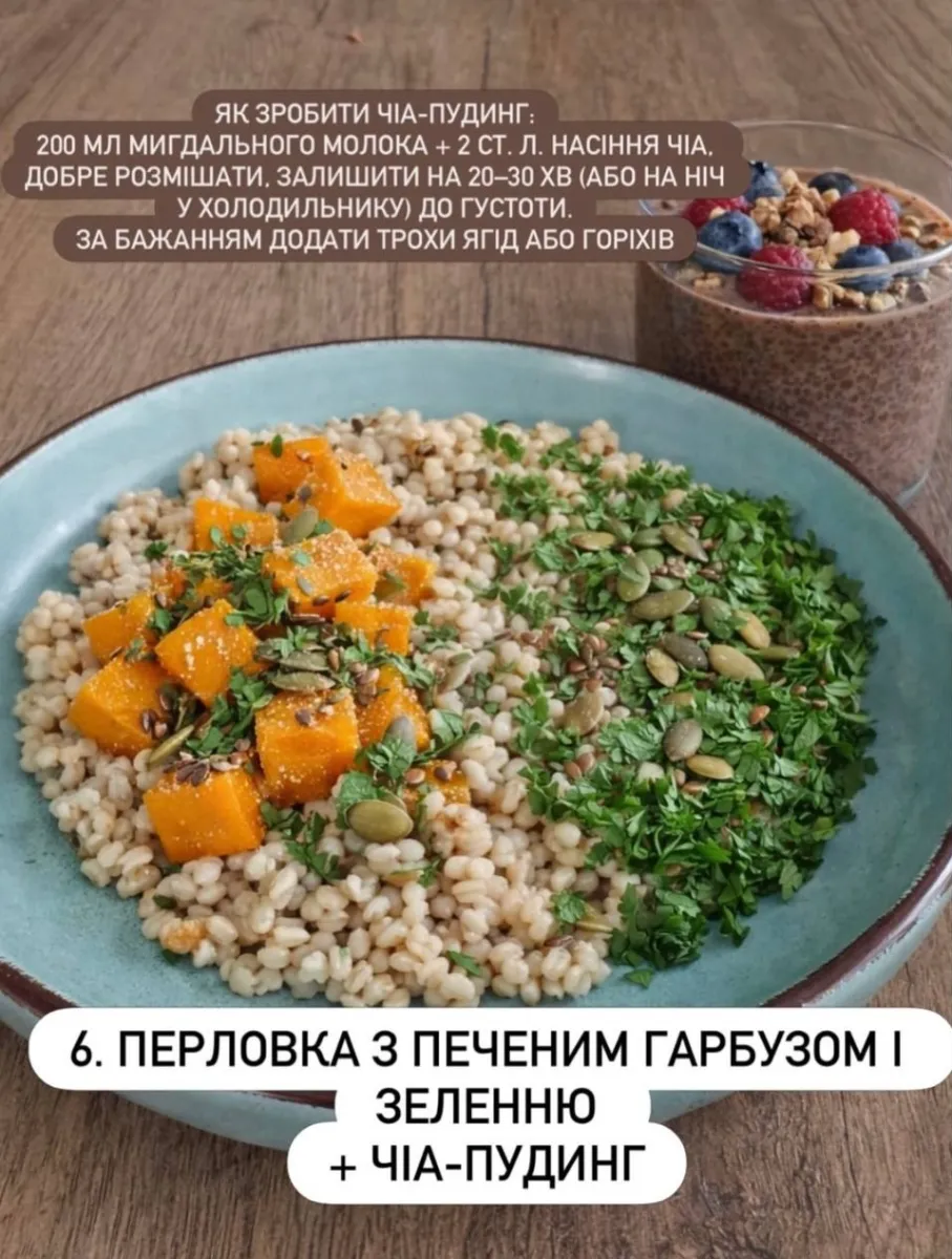 - 07 Перловка з печеним гарбузом і зеленню + чіа-пудинг
