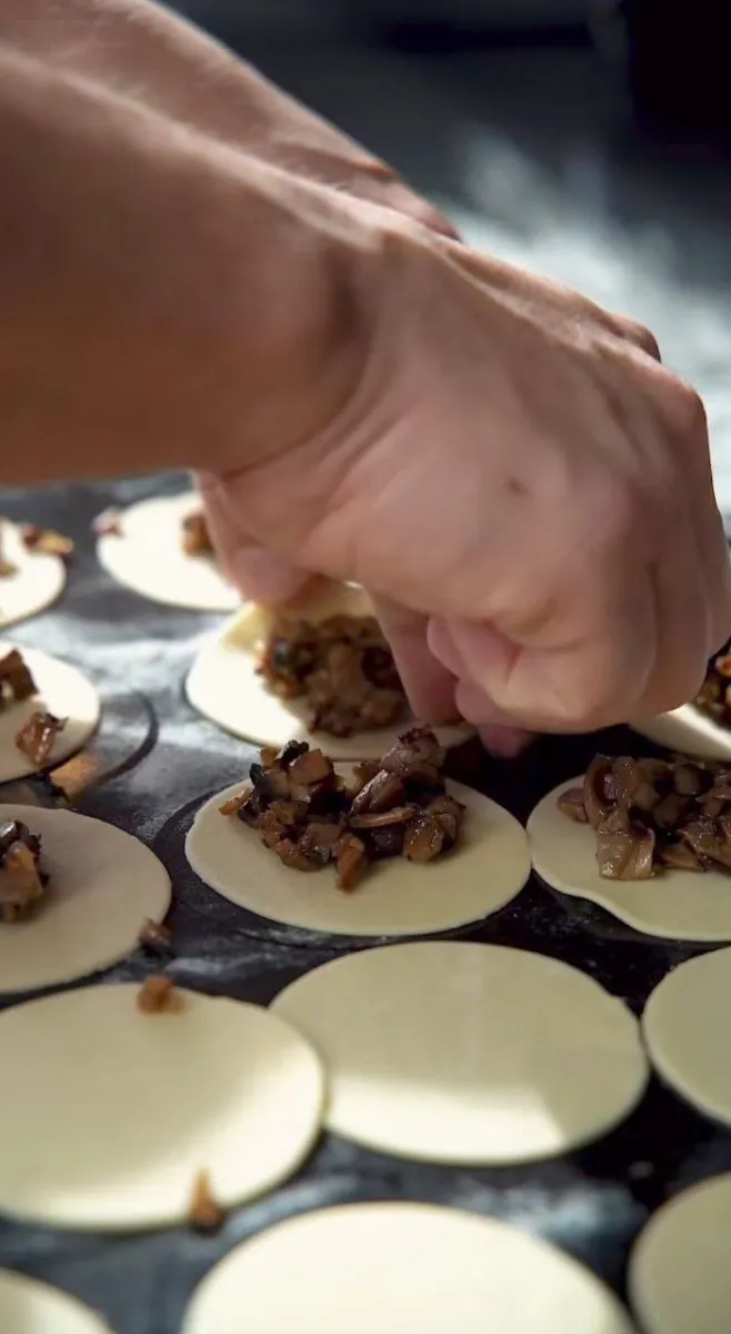 - Далі зваріть грибний бульйон: замочені сушені гриби проваріть разом з овочами близько 30 хвилин. Після цього гриби вийміть для начинки, а бульйон процідіть.