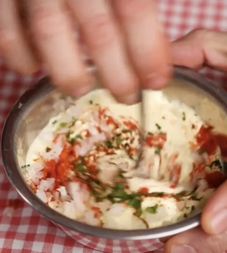 Для соусу потрібно збити яйце з лимонним соком, сіллю, перцем і оливковою олією до однорідності. Також додати подрібнену зелень, паприку та дрібно нарізану цибулю і перемішати.
