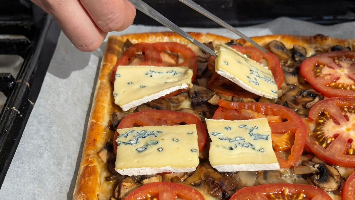 Для пирога потрібні листково‑дріжджове тісто, цибуля, шампіньйони, томати, яйце та сир Cambozola. За рецептом, цибулю та гриби слід підсмажити до готовності, охолодити, а тісто – розморозити, злегка розкачати та сформувати бортики.