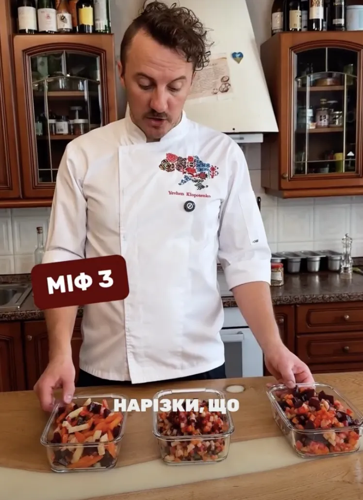 Третій міф – нарізка не впливає на кінцевий результат. Клопотенко доводить протилежне: рівна нарізка дозволяє відчути кожен інгредієнт окремо, хаотична ж – лише смак найбільшого шматка.