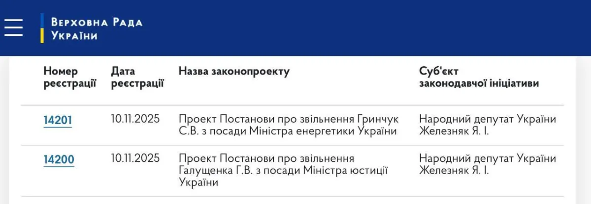 Тим часом у Верховній Раді зареєстровано дві постанови — про звільнення Германa Галущенка з посади міністра енергетики та Дениса Малюськи з посади міністра юстиції. Найближче засідання парламенту заплановане на 18 листопада. Обидві постанови подав нардеп Ярослав Железняк.