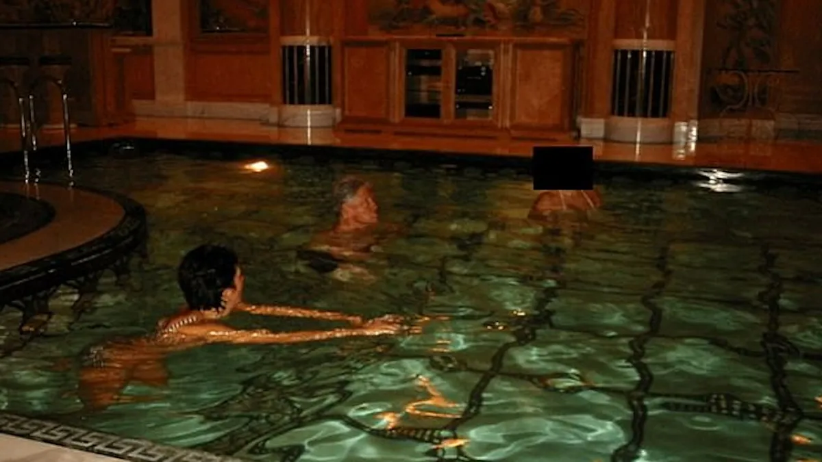 Клінтон у басейні з давньою довіреною особою Епштейна Гіслейн Максвеллом та людиною, чиє обличчя також було відредаговано. Фото: Міністерство юстиції