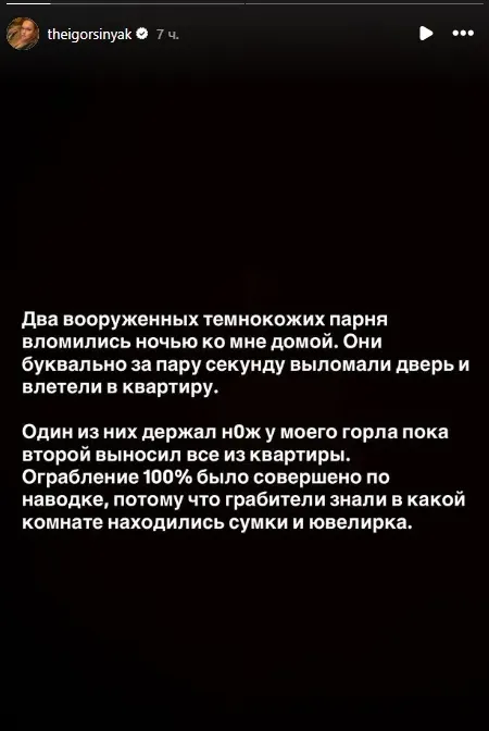 «Двоє озброєних хлопців вдерлися вночі до мене додому. Вони буквально за пару секунд зламали двері. Один тримав ніж біля мого горла, поки другий забирав сумки та ювелірні вироби. Це на 100% була наводка — вони знали, в якій кімнаті лежать цінні речі», — заявив блогер.