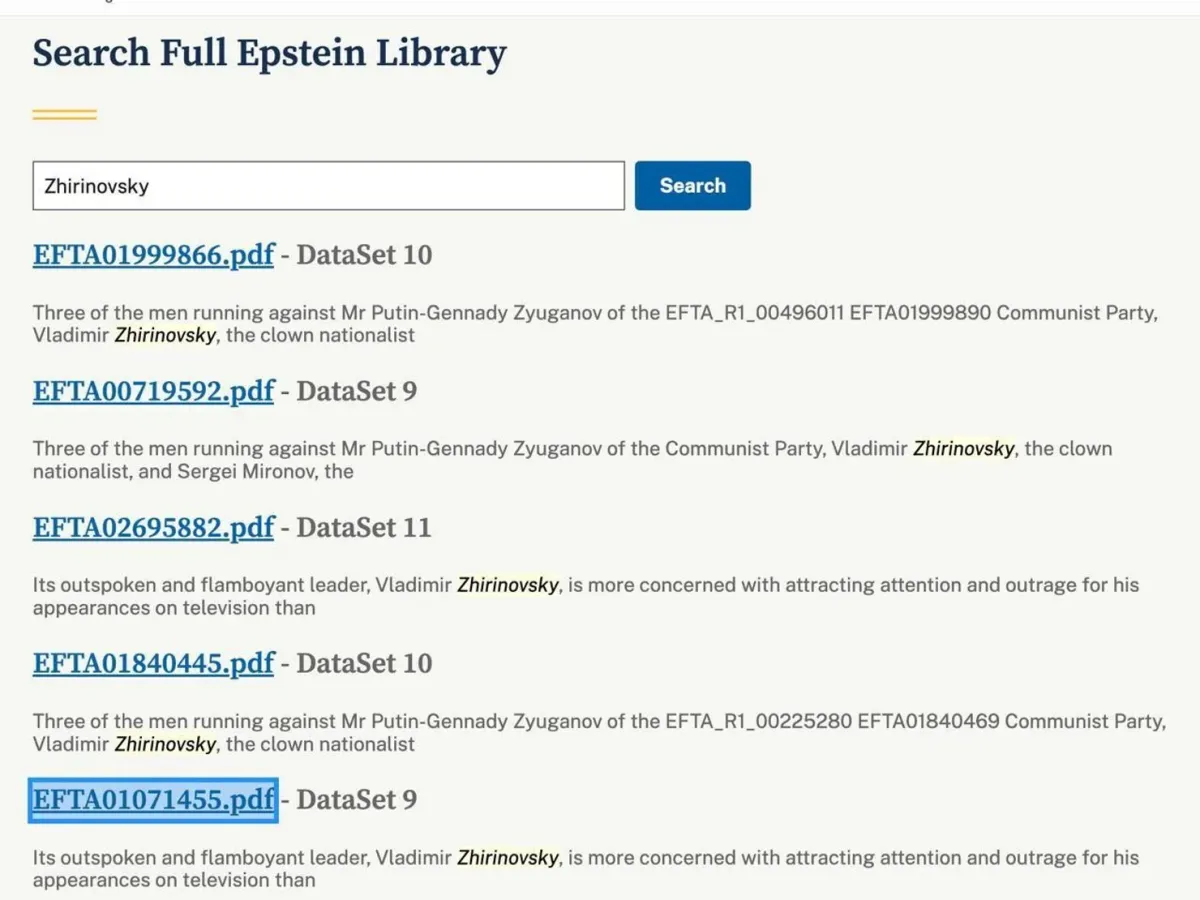 Згадки про Жирінвського у файлах Епштейна: Фото: Скриншот
