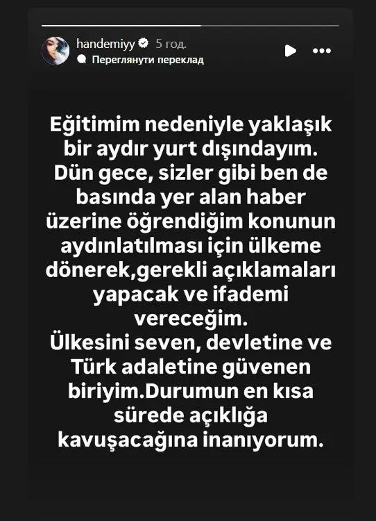 «Я людина, яка любить свою країну та довіряє турецькому правосуддю. Вірю, що ситуація найближчим часом проясниться», – написала вона.