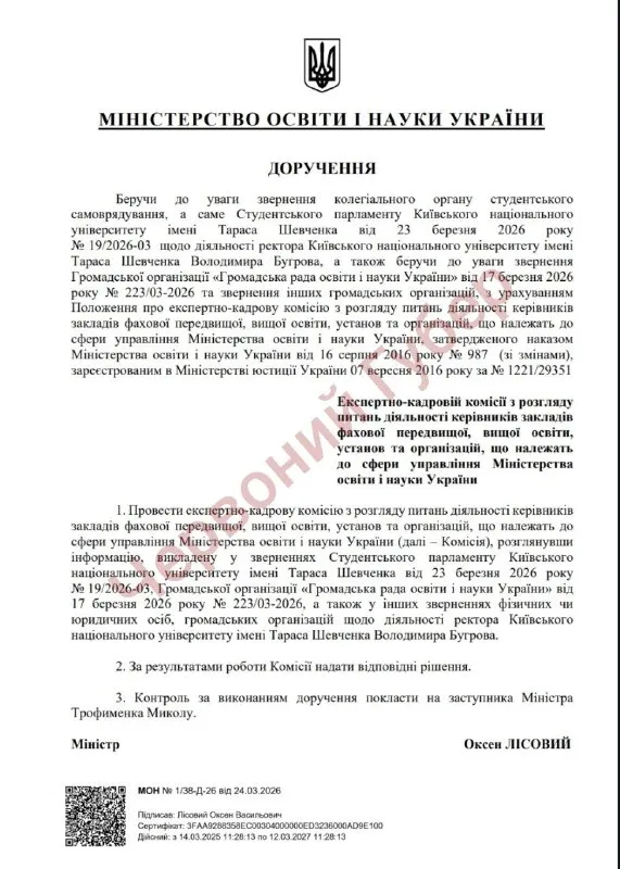 Документ на основі якого Міністерство освіти і науки України почало перевірку діяльності ректора Володимира Бугрова. Джерело: МОН