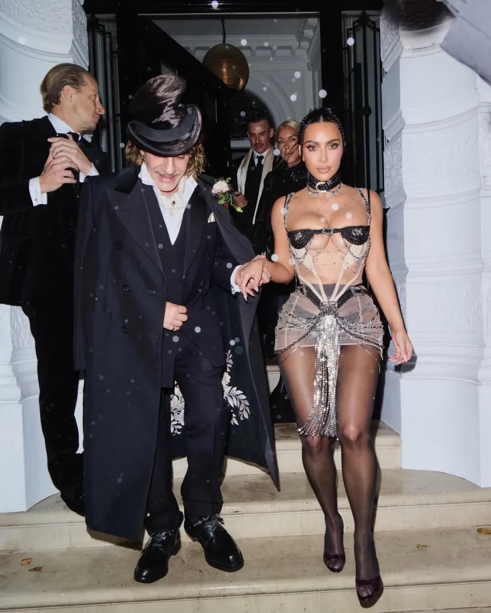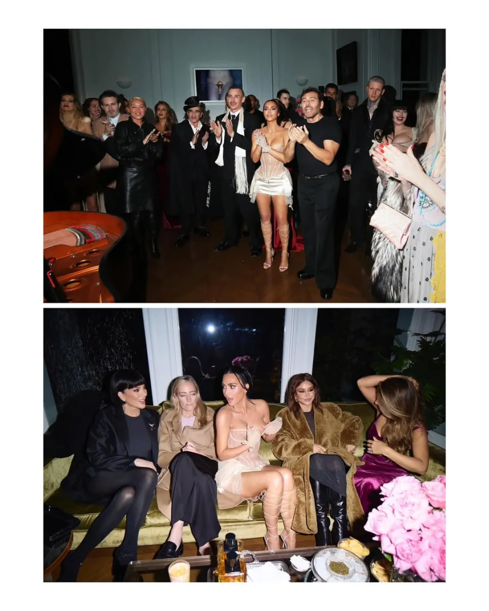 При вході на вечірку Кім з’явилася у прозорому корсеті з акцентом на декольте та довгій шовковій спідниці. Образ підкреслював її фігуру та відповідав стилю зірки, яка не боїться сміливих експериментів.