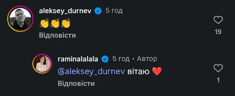 До речі, коментар залишив навіть Олексій Дурнєв, який також увійшов до ТОП-10 блогерів України. Раміна привітала і його з місцем у десятці.