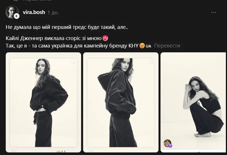 «Не думала, що мій перший тредс буде такий, але... Кайлі Дженнер виклала сторіс зі мною. Так, це я – та сама українка для кампейну бренду KHY», – написала Віра.