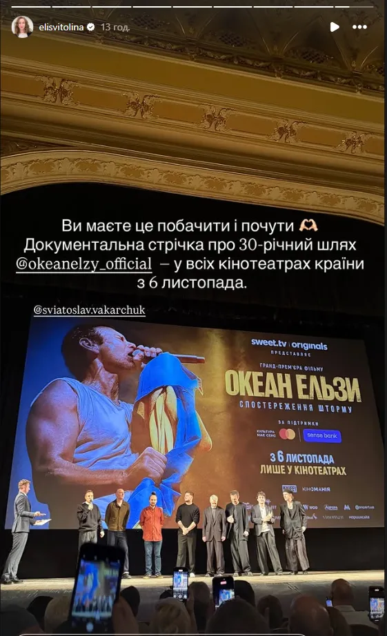 Зірки українського шоубізнесу відзначили допремʼєрний показ нової документальної стрічки за участі Святослава Вакарчука, «Океан Ельзи: Спостереження Шторму». Про це стало відомо зі сторінок знаменитостей у мережі Instagram.