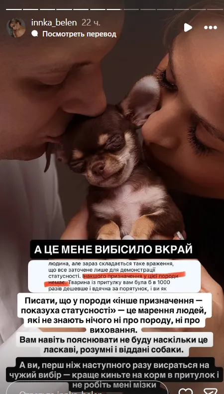 Переможниця 13-го сезону шоу «Холостяк», блогерка та волонтерка Інна Бєлєнь опинилася у центрі суперечки через покупку цуценяти породи чихуахуа.