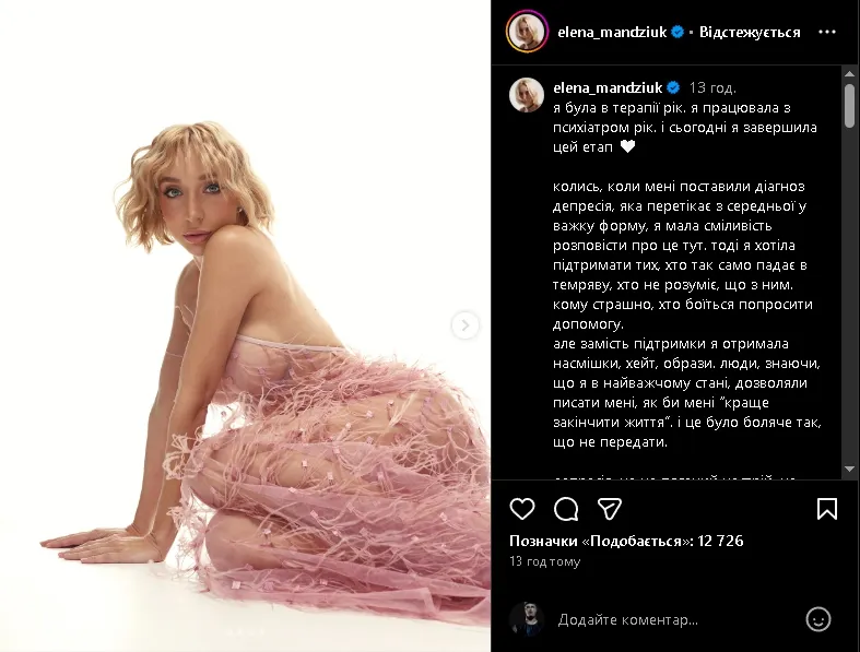 У інстаграмі Олена Мандзюк поділилася, що протягом року працювала з психіатром і завершила цей етап лікування: вона пройшла курс терапії, приймала антидепресанти і поступово поверталася до повноцінного життя.