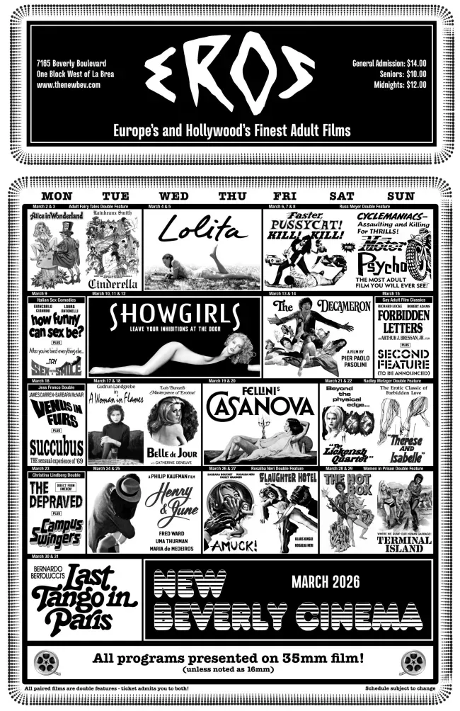 Крім еротичних фільмів, березнева програма включатиме роботи європейських майстрів, таких як Луїс Бунюель, Бернардо Бертолуччі, Федеріко Фелліні та П’єр Паоло Пазоліні. Також у New Beverly покажуть глем-роковий «Декамерон» Пазоліні та культові шедеври з жанру гріндхаус, серед яких «Гарячий ящик» та «Термінал Айленд».