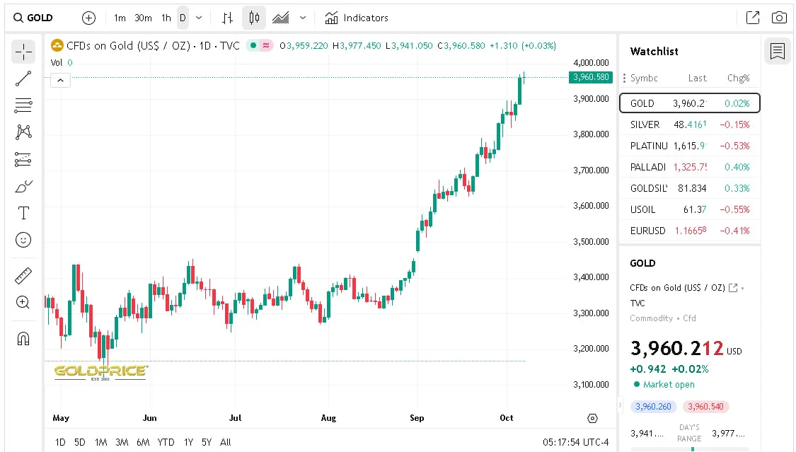 7 жовтня ціна золота на світових ринках зросла до рекордних $3985,37 за унцію, що еквівалентно $128,56 за грам. Це найвище значення з 1979 року.