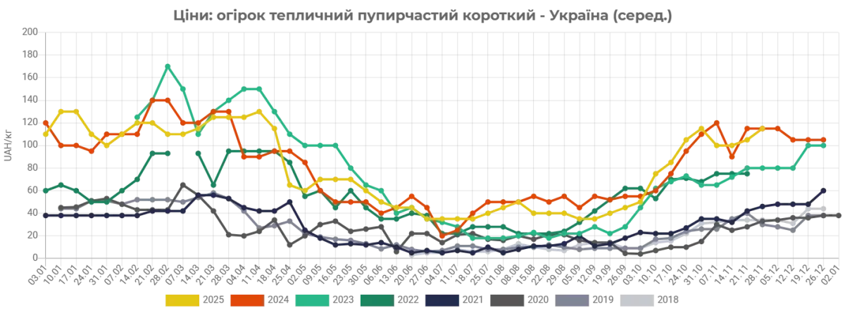 На ринках України зафіксовано стійке зростання вартості огірків. Як видно з інфографіки «EastFruit», оптові ціни нині перебувають у межах 100–130 грн за кілограм, залежно від якості та обсягу партії. Це приблизно на 10% більше, ніж тижнем раніше, і є найвищим показником щонайменше за вісім років.