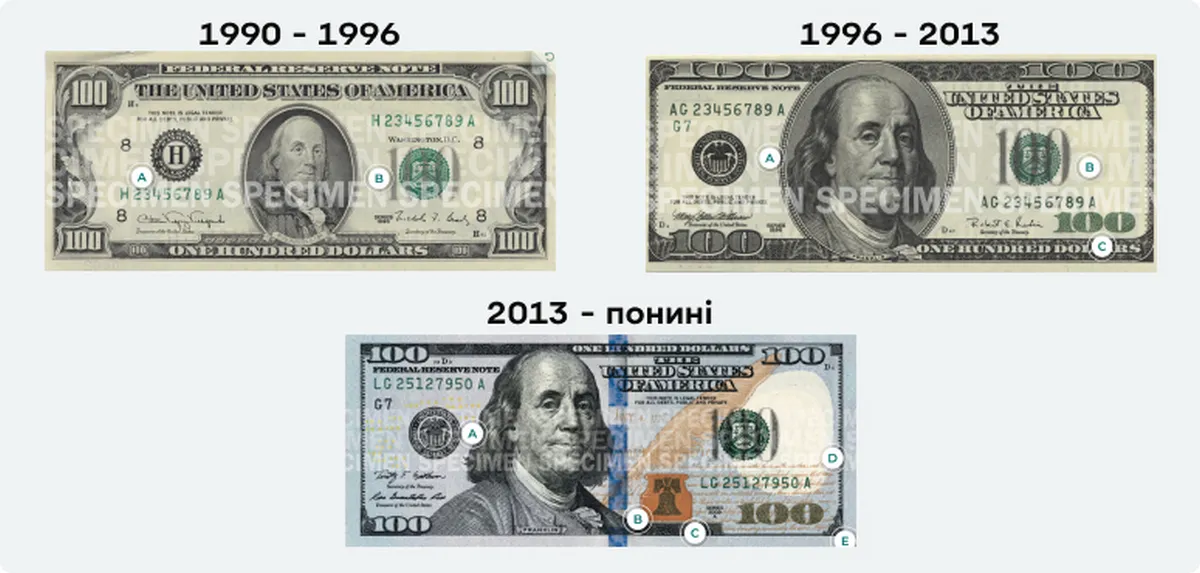 Різниця між різними 100-доларовими купюрами. Фото: privatbank.ua