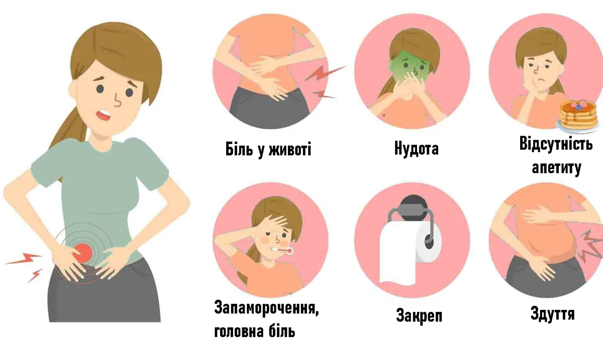 Типовий симптом – біль, що починається навколо пупка або у верхніх відділах живота й поступово зміщується вправо.