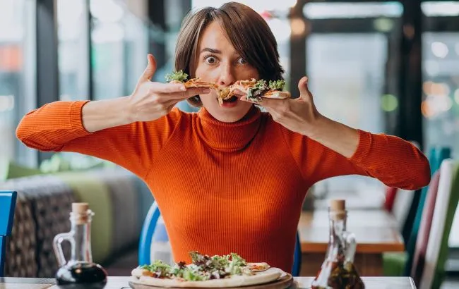 Дівчина намагається з'їсти два шматки піци одночасно. Фото: Freepick
