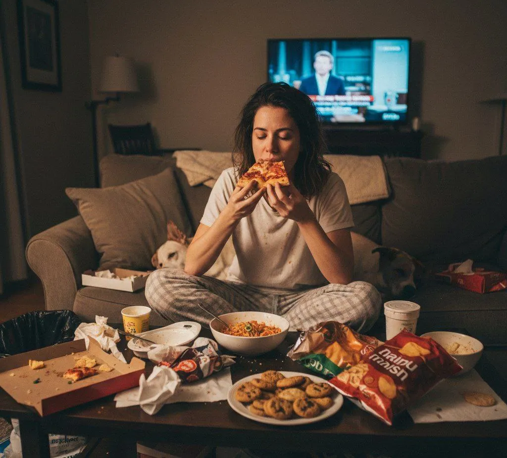 Нічні перекуси часто відбуваються несвідомо – під час перегляду відео або читання. Зазвичай це калорійна їжа, енергія з якої не встигає витратитися до ранку й майже гарантовано відкладається у вигляді зайвої ваги.