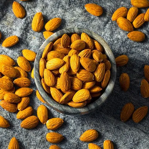Мигдаль – горіх, який містить білок, клітковину та корисні жири. У порції 28 грамів міститься близько 6 грамів білка, понад 3 грами клітковини та 14 грамів жиру.