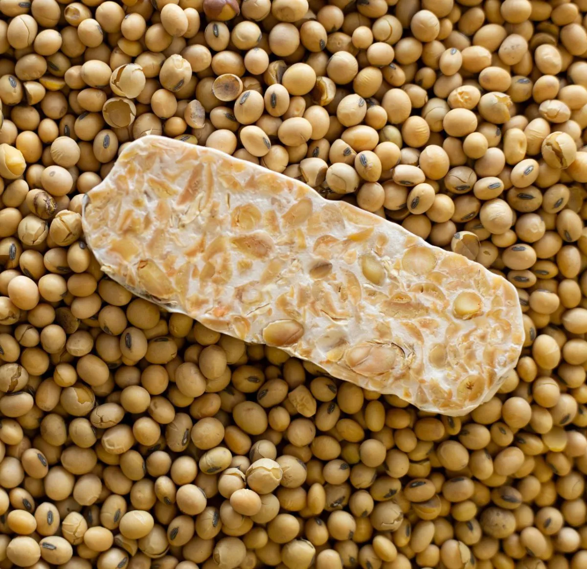 Цей продукт виготовляють із ферментованих соєвих бобів. Він містить значно більше білка та жирів, ніж звичайні яйця – близько 20 грамів білка та 11 грамів жиру на 100 грамів готового темпе.