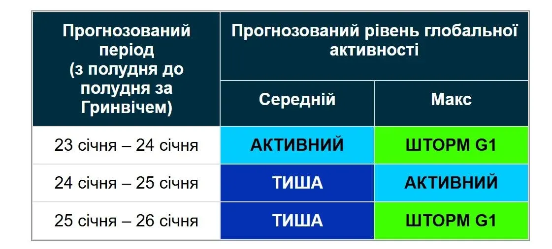 Найбільша геомагнітна активність очікується у другій половині дня за київським часом. Водночас остаточний рівень бурі може змінюватися ближче до дати на основі супутникових спостережень.