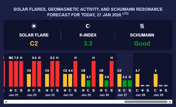 Сьогодні, 27 січня, магнітна буря залишається на слабкому рівні. Очікується К-індекс 3,3, що відповідає зеленому рівню геомагнітної активності. Про це повідомили Meteoagent та Британська геологічна служба.