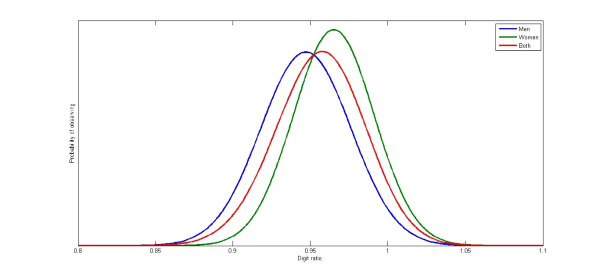 Розподіл пальцевого індексу в популяції у жінок (зелений) і чоловіків (синій). Червона лінія - результуючий графік, що відображає розподіл незалежно від статі.