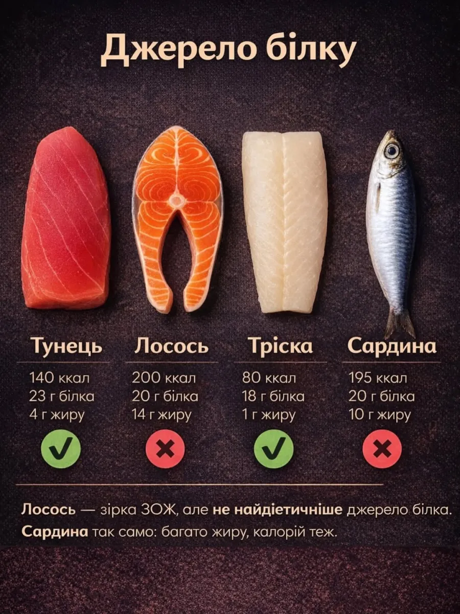Риба теж може бути різною: тунець і тріска – легкі та білкові, тоді як лосось чи сардина містять більше жиру, тому їх варто розглядати як джерело корисних жирів, а не як «чистий білок».
