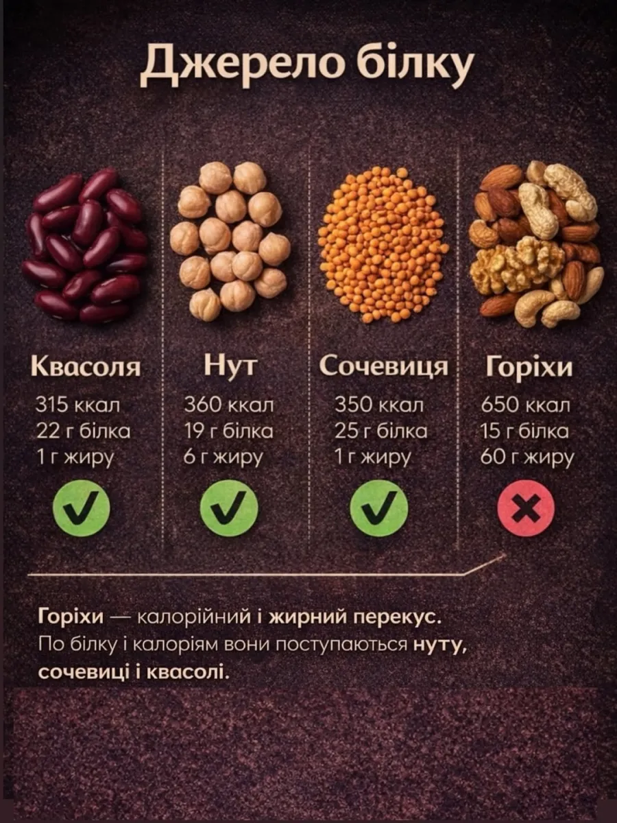 Наприклад, бобові — квасоля, нут, сочевиця – дають багато білка при мінімумі жиру, тому добре підходять для щоденного раціону.