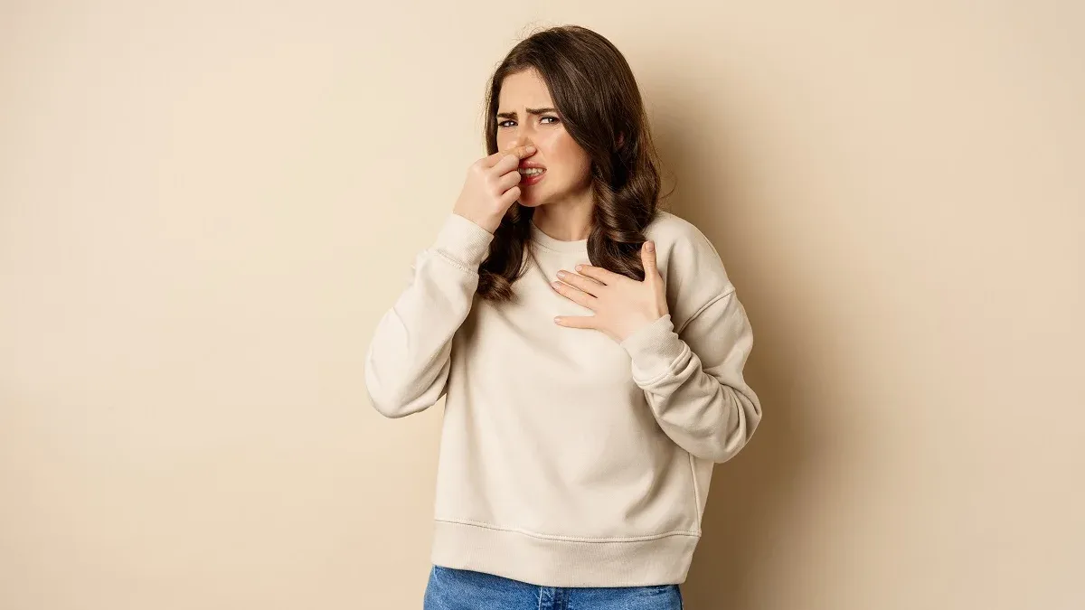 Дівчина затуляє ніс через неприємний запах. Фото: Pexels