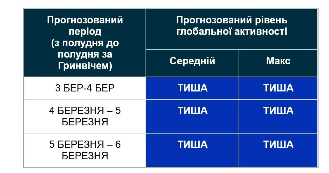 У середу, 4 березня, очікується сонячна активність з К-індексом 3,7 (зелений рівень), що відповідає слабким магнітним бурям. Про це стало відомо з даних, які надає Центр прогнозування космічної погоди (SWPC) NOAA.